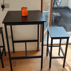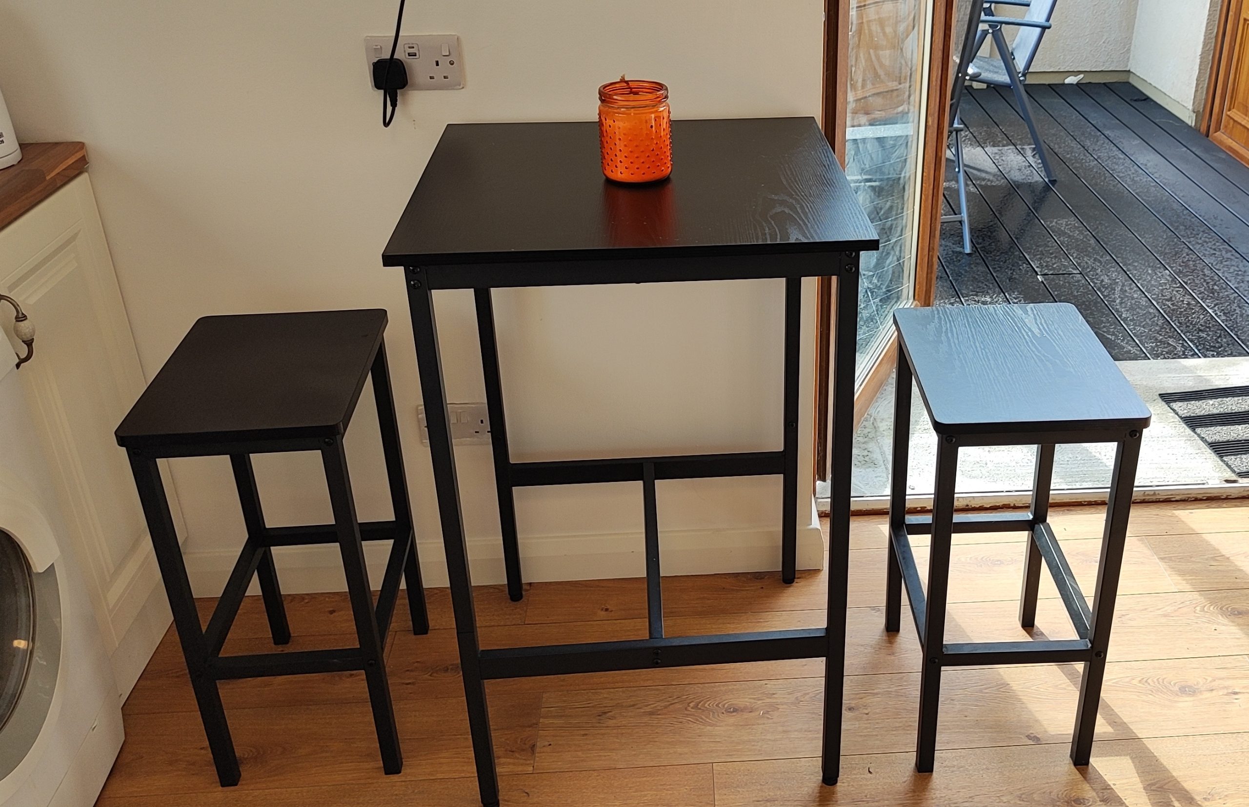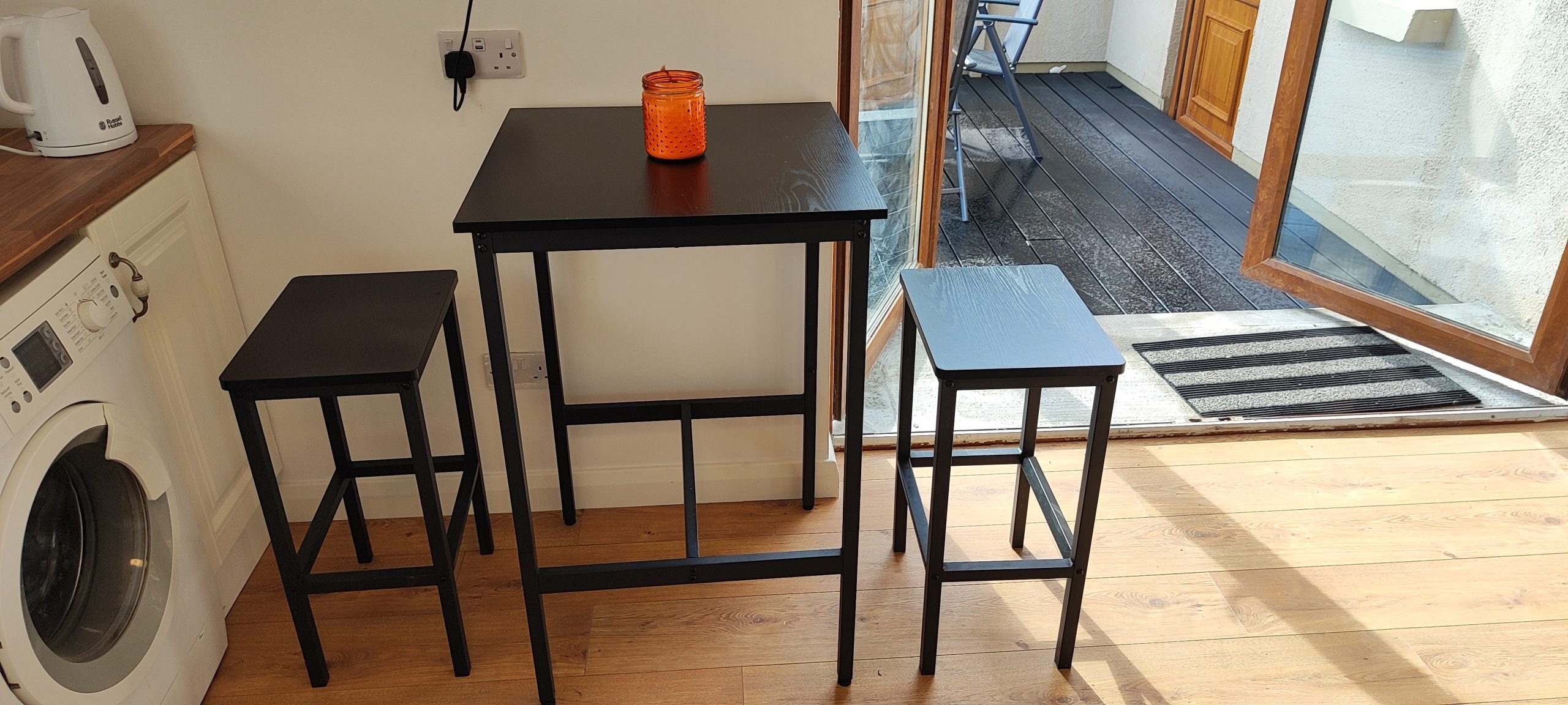 It has a modern fully equipped kitchen, and state-of-the-art appliances, breakfast bar dining table and stools, perfect for dining.